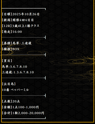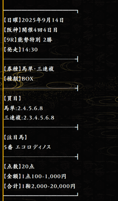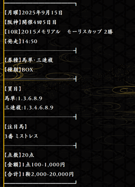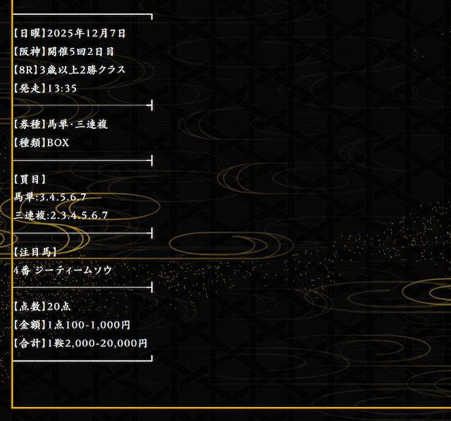各レース、馬単5頭BOX・三連複6頭BOXの買い目が提供されます。今回、私は検証のために両方勝負しましたが、1点1000円で買うと40点で40,000円の勝負になるので、馬単・三連複のどちらかにしたり、1点の金額を減らしたり、何らかの調整を入れるのもアリだと思います。