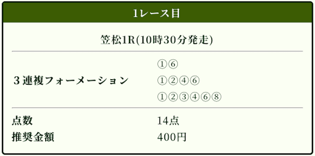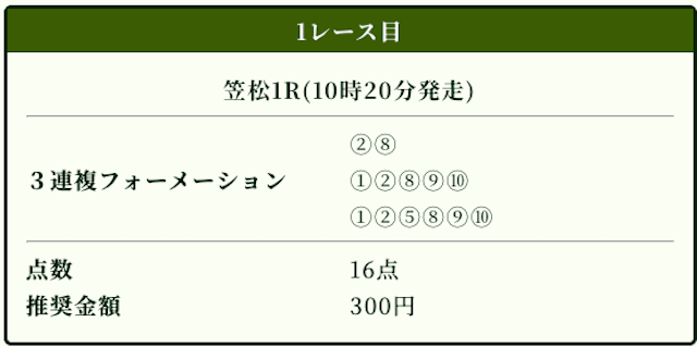 | 船橋競馬場 | 1/1 | 100% | 10,900円 | 6,000円 | 4,900円 | 181.7% |