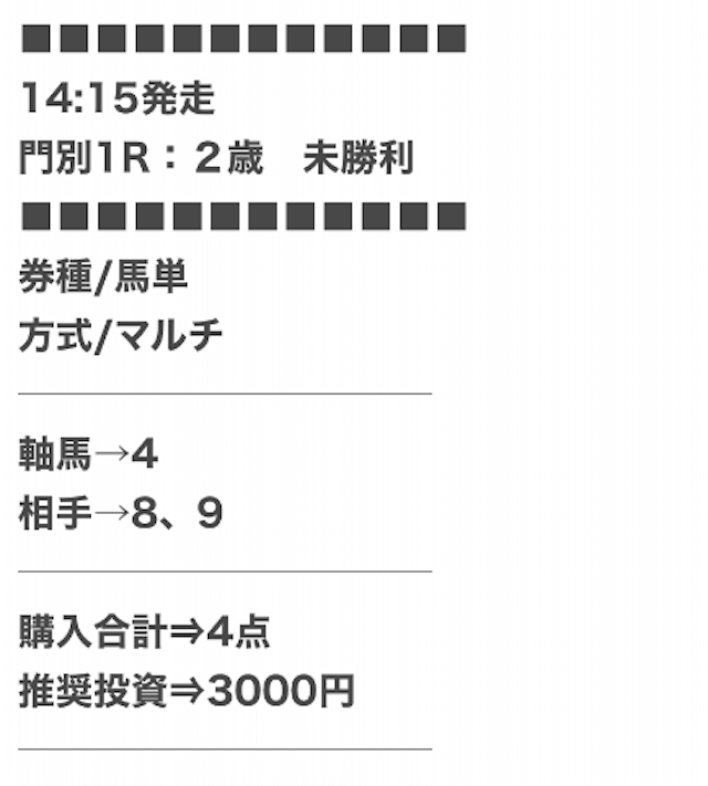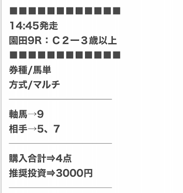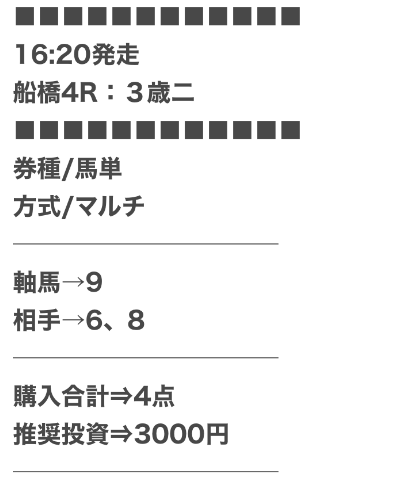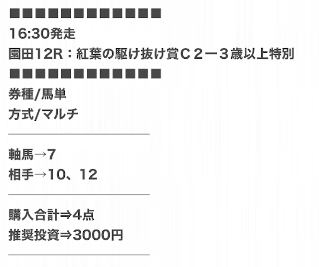 | 戦績 | 313戦253勝60敗 | 的中率 | 80.8% | 回収率 | 234.8% |