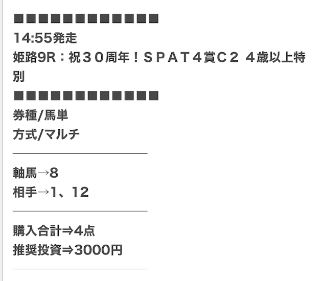 | 戦績 | 345戦280勝65敗 | 的中率 | 81.4% | 回収率 | 237.7% |