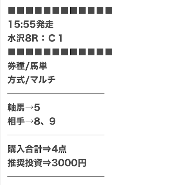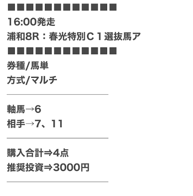 | 戦績 | 358戦291勝67敗 | 的中率 | 81.6% | 回収率 | 240.2% |