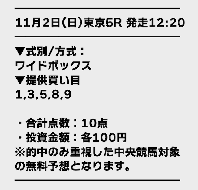 | 中山競馬場 | 5/5 | 100% | 99,800円 | 50,000円 | 49,800円 | 199.6% |