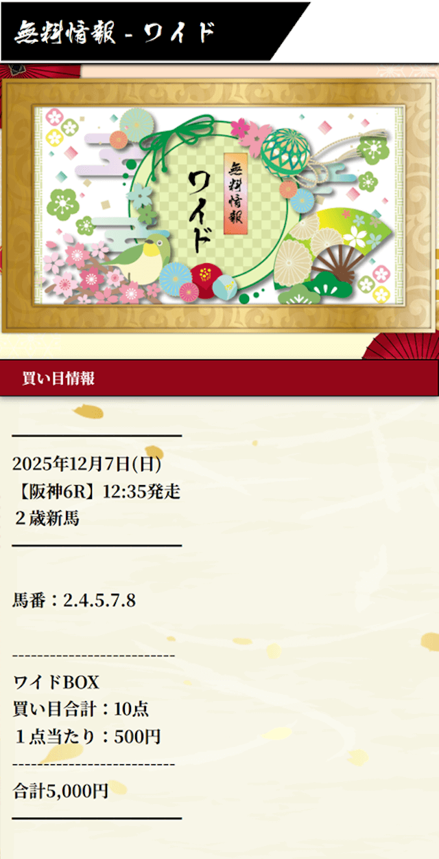 | 2025年 | 勝敗 | 的中率 | 払戻金額 | 投資金額 | 利益 | 回収率 |