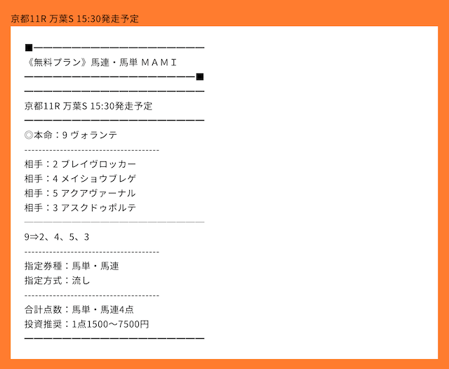 | 戦績 | 96戦81勝15敗 | 的中率 | 85.4% | 回収率 | 269% |