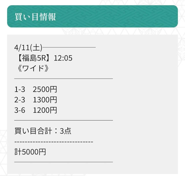| 戦績 | 41戦32勝9敗 | 的中率 | 78% | 回収率 | 350.2% |