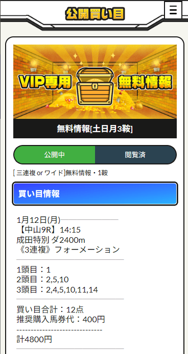 | 戦績 | 87戦57勝30敗 | 的中率 | 65.5% | 回収率 | 490.9% |
