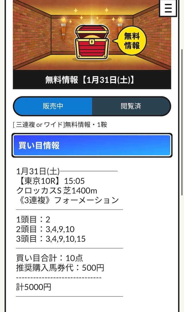 | 戦績 | 90戦59勝31敗 | 的中率 | 65.6% | 回収率 | 477.2% |