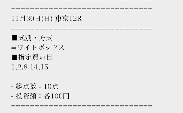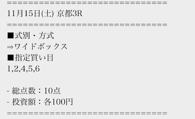| 勝敗 | 的中率 | 払戻金額 | 投資金額 | 利益 | 回収率 | |