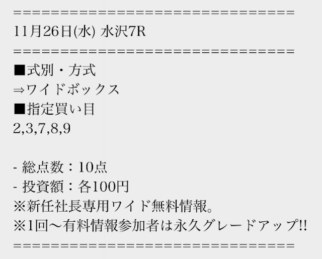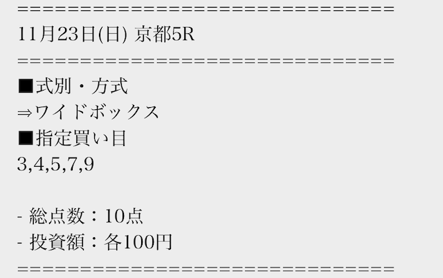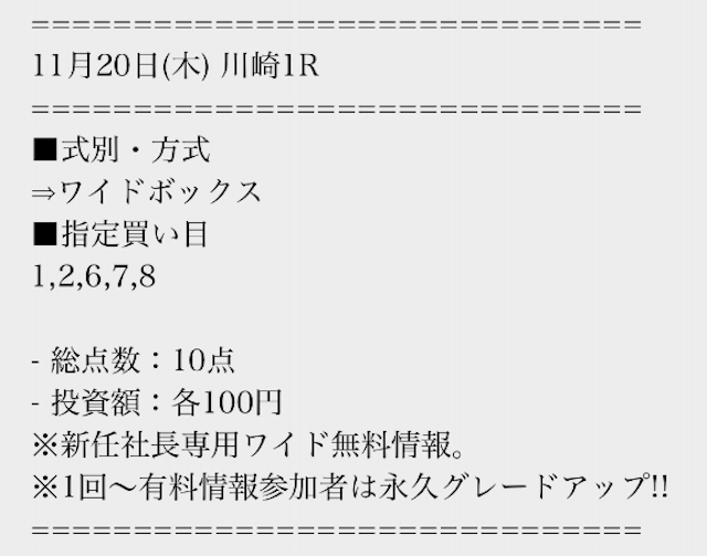 | 戦績 | 164戦142勝22敗 | 的中率 | 90.9% | 回収率 | 234.5% |