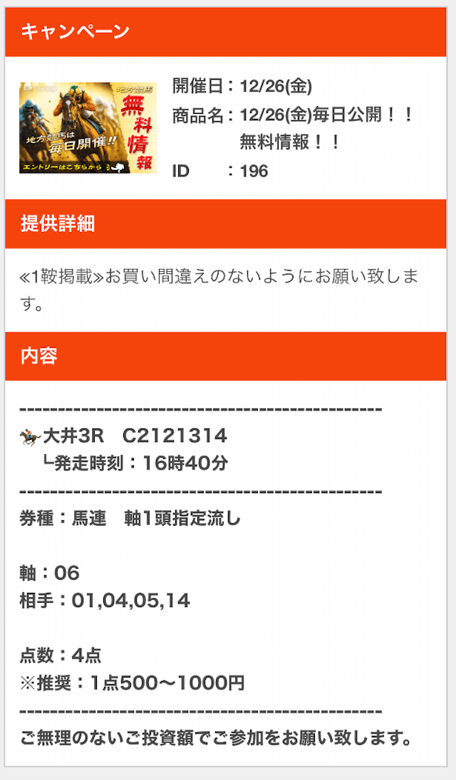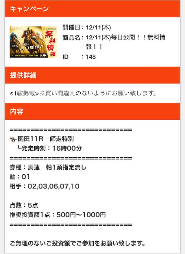 | 戦績 | 41戦37勝4敗 | 的中率 | 92.7% | 回収率 | 276.6% |
