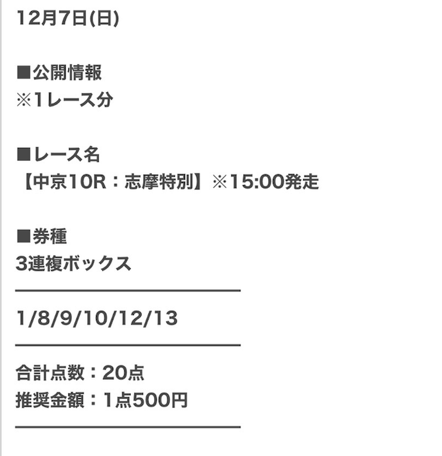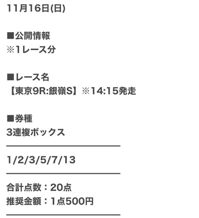 | 戦績 | 134戦106勝28敗 | 的中率 | 80.6% | 回収率 | 275.4% |