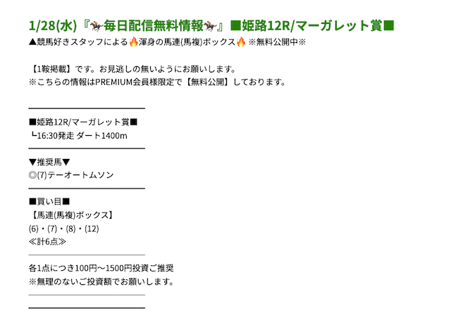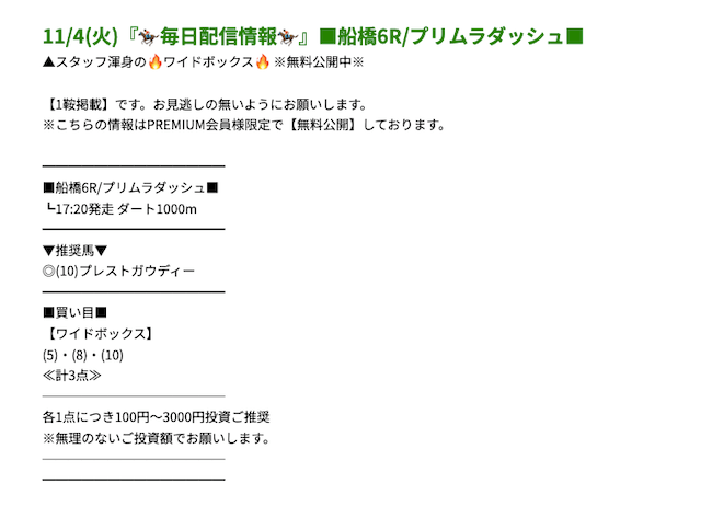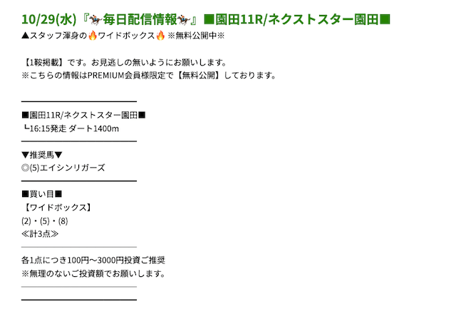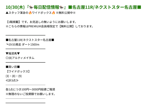 プレミアムの無料予想は、複数券種での買い目が公開されます。