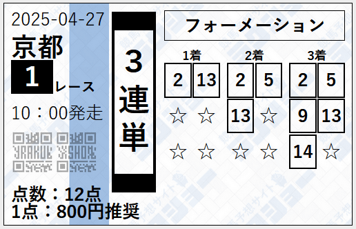 ラクショープラスの無料予想における初参加は、2025年1月10日「京都11R」