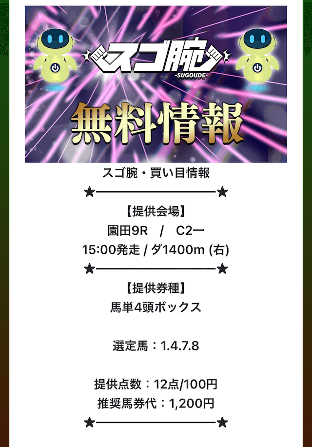 このような予想を日々提供しているので、使えば使うほどしっかりと稼げるチャンスは増えると感じました。