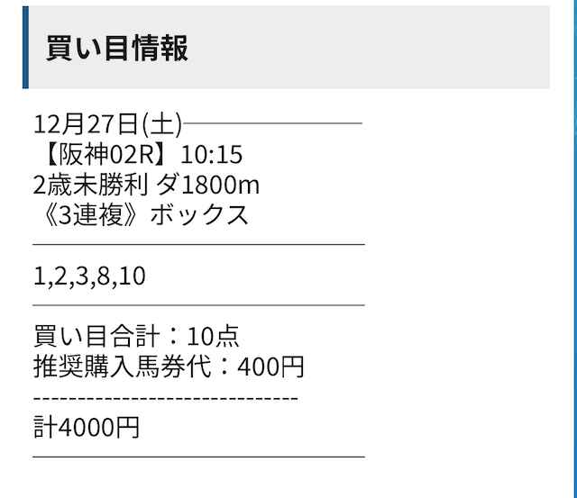 参加前にチェックしていた無料予想で「人気だけを追いかけない予想で結果を残している」という傾向だったので、多少の期待を胸に馬券を購入しました。