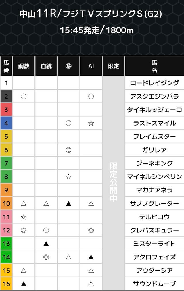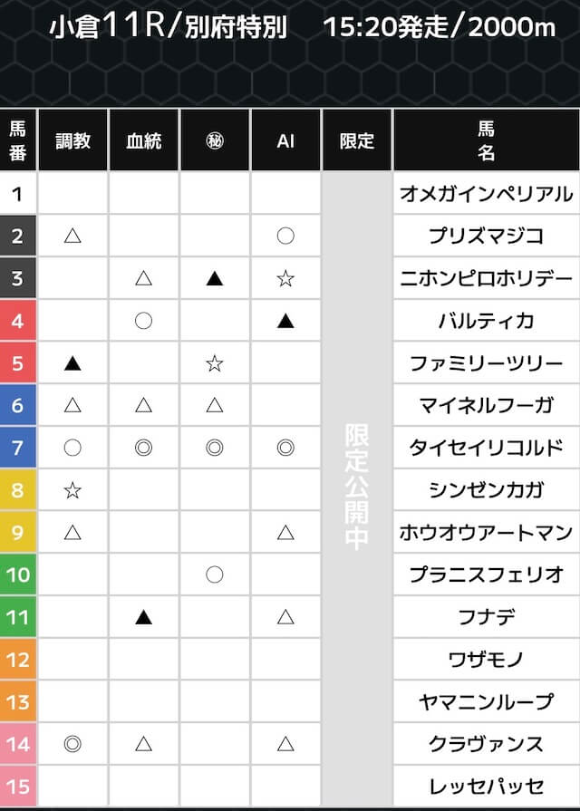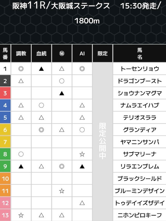 スーパーマンバケンの無料予想は、各ファクターごとの印で公開されています。