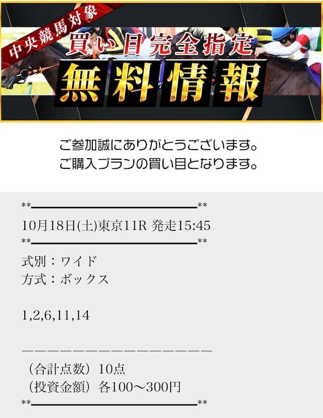 無料予想を利用する分には費用はかかりません。有料予想を購入する時のみに費用がかかるので、安心して利用してみてください。