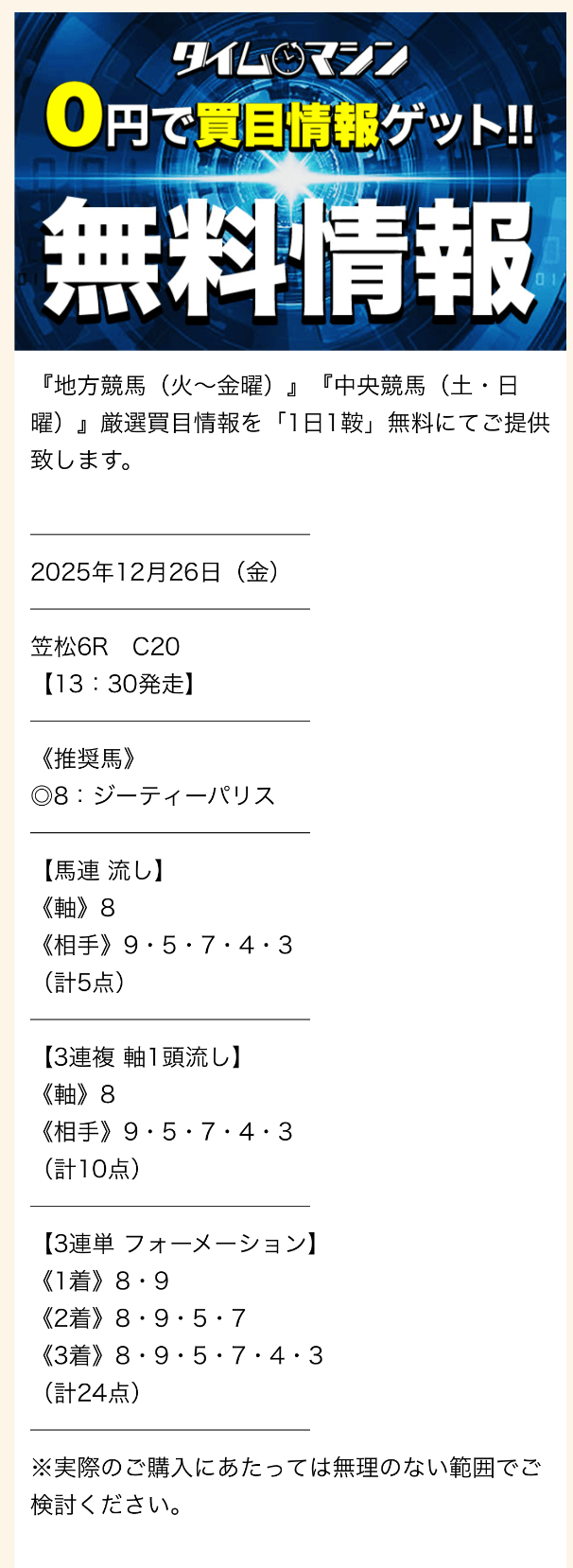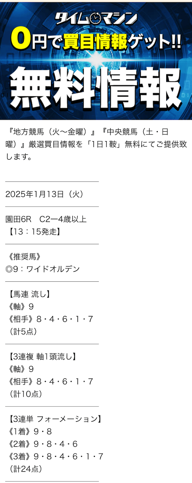 精度に加えて、毎日のように無料予想が見れるから好きなタイミングで勝負できるっていうのもタイムマシンの魅力だと思う。