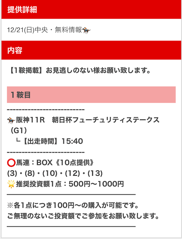 上記のフローを取れば、公開時間に無料予想を閲覧することができました。