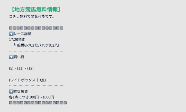 無料予想に何回か丸のりしたけど、全部的中した。どれも三連単で当たったから、非常に満足。どの買い目も少点数での予想だったので、軍資金が少なくても安心して参加できた。