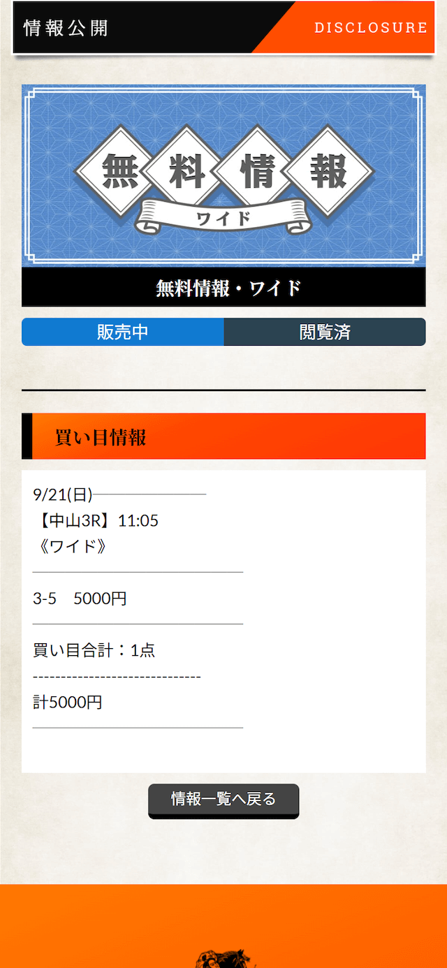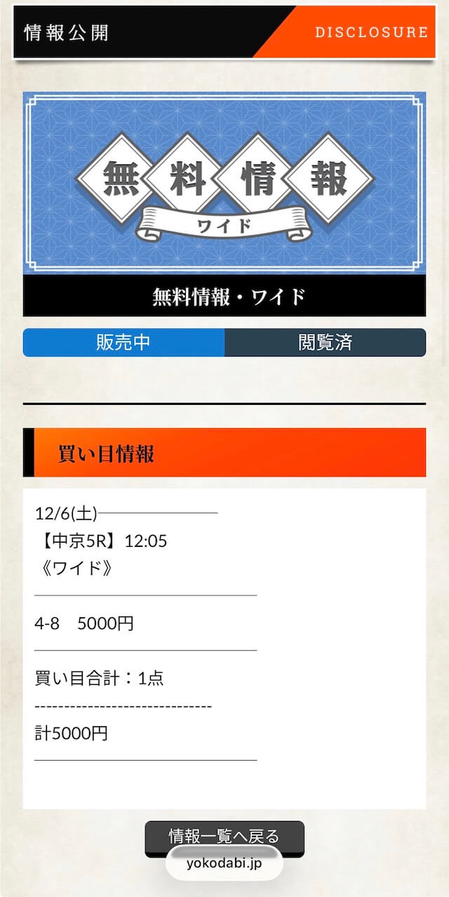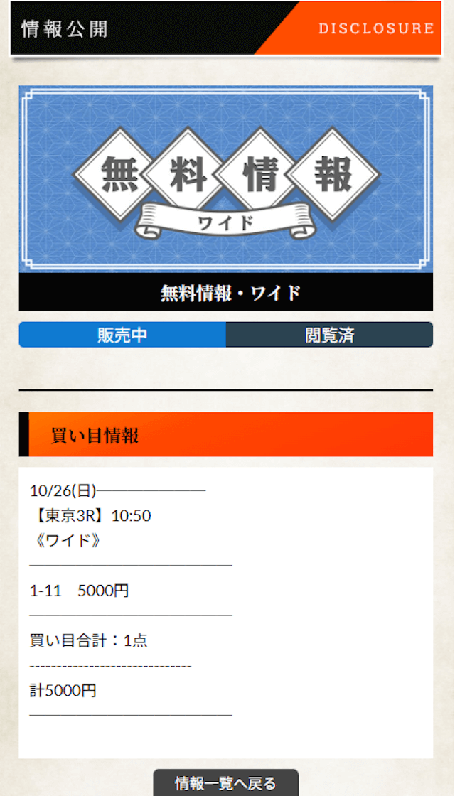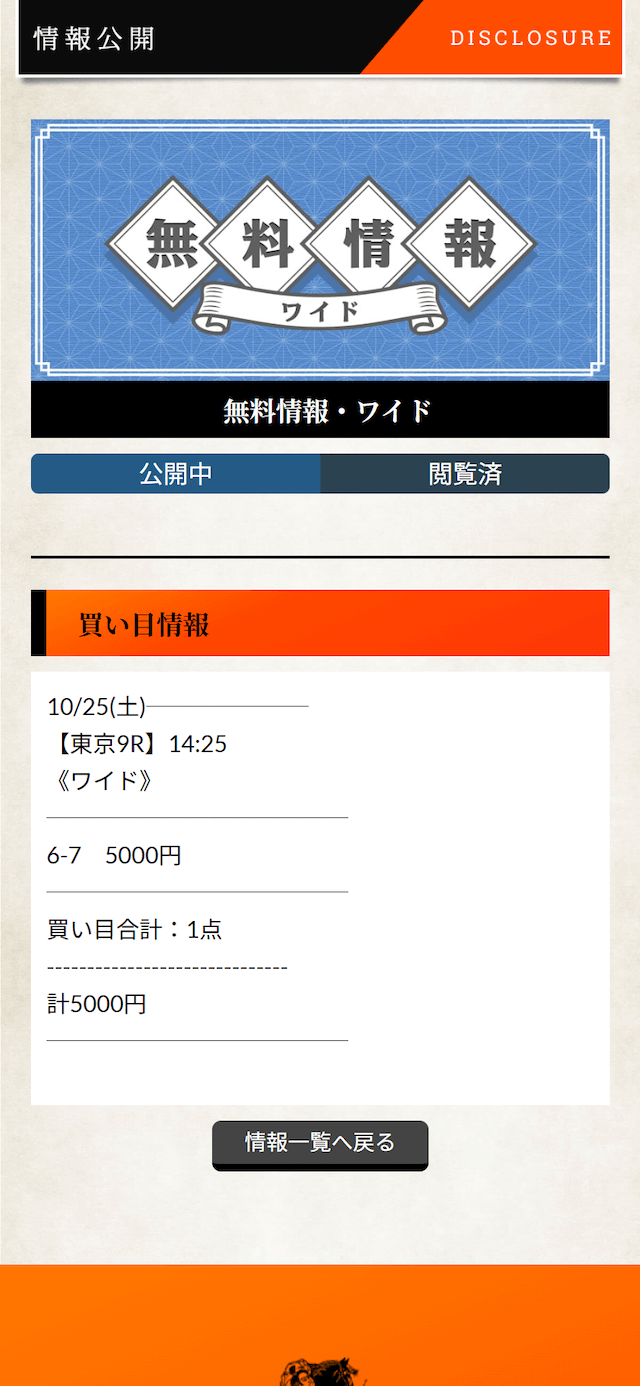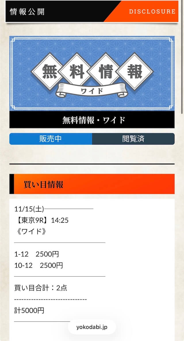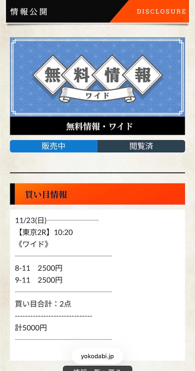 無料予想を確認するためには、黄枠の「情報公開」をタップ。