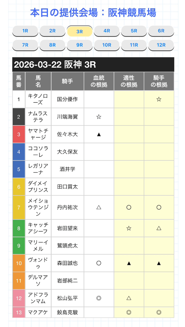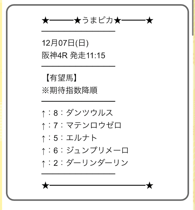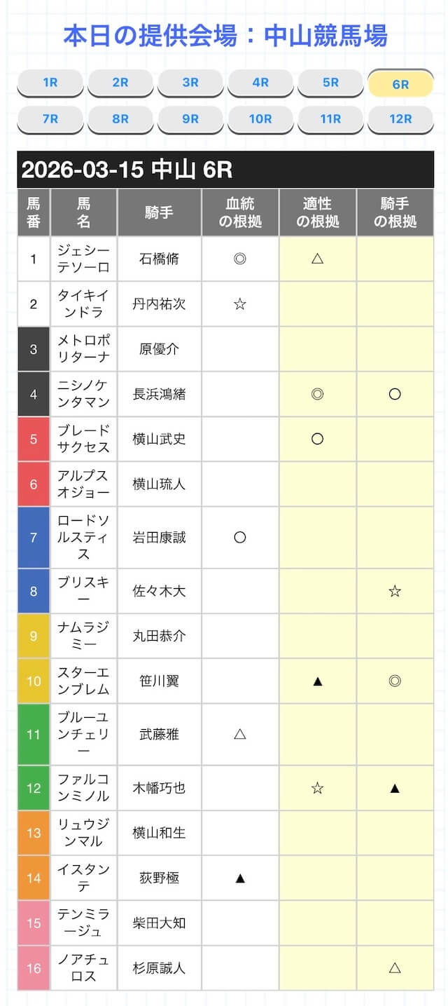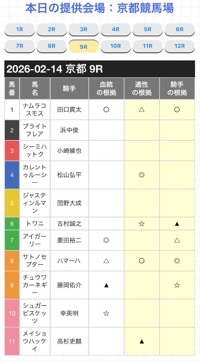 予想印のみの公開のため、買い目自体が欲しい方にとっては自ら買い目を組み立てなければいけませんが、自分の予想の確認に使ったり、◎の馬を軸に馬券を組み立てていくといいでしょう。